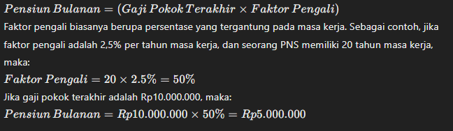 Pemerintah menetapkan faktor pengali tertentu yang digunakan dalam perhitungan pensiun. Faktor ini didasarkan pada masa kerja PNS. Misalnya, untuk setiap tahun masa kerja, ada faktor pengali tertentu yang digunakan untuk menghitung besarnya tunjangan pensiun.