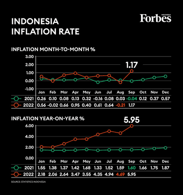 Menurut data yang dilaporkan oleh tradingeconomics.com, tingkat inflasi tahunan Indonesia meningkat menjadi 5,95% pada September 2022 dari 4,96% yang mana ini adalah level tertinggi sejak Oktober 2015. Tingkat inflasi berada di atas batas atas kisaran target bank sentral 2-4% selama empat bulan berturut-turut.