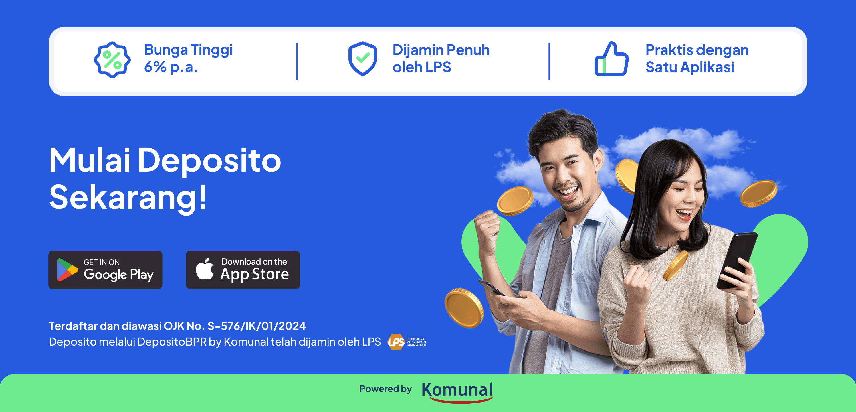 Menabung di program DepositoBPR by Komunal bisa menjadi salah satu pertimbangan untukmu. Sebab, DepositoBPR memiliki suku bunga tertinggi hingga 6,75% per tahun dan dijamin oleh Lembaga Penjamin Simpanan (LPS).