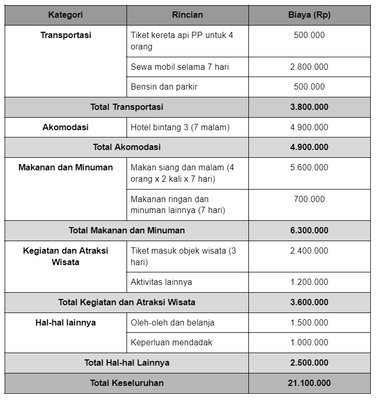 Contoh, keluarga yang terdiri dari orang tua dan dua anaknya ingin mengisi liburan sekolah dengan mengunjungi Bandung selama satu minggu. Berikut adalah contoh anggaran liburan untuk keluarga yang berangkat dari Jakarta untuk liburan ke Bandung: