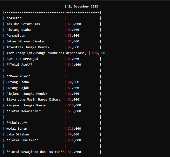 Pastikan bahwa total aset sama dengan total kewajiban dan ekuitas. Lakukan pemeriksaan ulang untuk memastikan tidak ada kesalahan atau data yang terlewat.