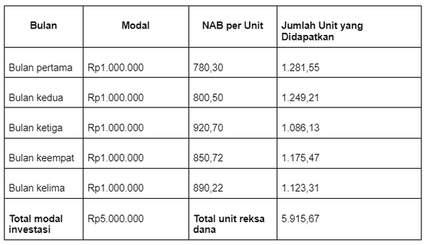 Misalnya, kamu memiliki modal sebesar Rp5 juta dan berniat untuk investasi di reksa dana dengan jangka waktu 5 bulan.