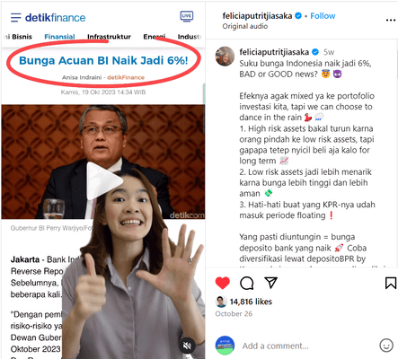 Felicia menyebutkan salah satu dampak positif dari kenaikan ini yaitu bunga deposito bank yang juga mengalami kenaikan. Bahkan, bunga deposito di BPR diperkirakan mencapai 7% sehingga keuntungan akan lebih maksimal. Nah, kamu bisa mencoba diversifikasi lewat aplikasi DepositoBPR by Komunal. Penasaran alasannya? Simak video dari Felicia sampai habis, ya!
