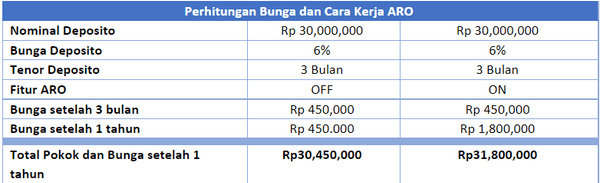 ARO (Automatic Roll Over) dalam deposito adalah fasilitas yang memungkinkan deposito Anda untuk diperpanjang secara otomatis setelah jatuh tempo, tanpa perlu melakukan tindakan manual. Berikut adalah contoh penerapan ARO dalam deposito: