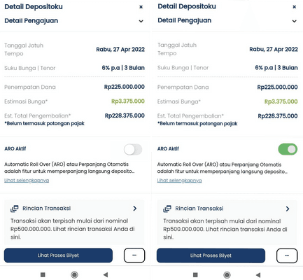 Ketika mengaktifkan Fitur ARO, hanya pokok deposito yang diperpanjang dan bunga akan dicairkan setiap tanggal jatuh tempo deposito tersebut.