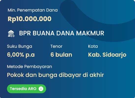 Sedangkan, deposito adalah salah satu jenis penyimpanan yang biasanya memiliki masa waktu tertentu dengan tenor yang beragam. Di DepositoBPR minimum deposito adalah Rp1,000,000 dengan minimum tenor dari 1 sampai 12 bulan. Nah, DepositoBPR memiliki 2 jenis produk, yaitu ARO Deposito dan non-ARO Deposito.