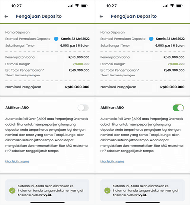 Pada saat deposan mengajukan deposito melalui aplikasi DepositoBPR, deposan dapat melihat tombol yang bertuliskan “Aktifkan ARO”. Ketika deposan mengaktifkan tombol tersebut maka fitur ARO pada deposito yang deposan ajukan akan aktif sampai dengan saat deposan menonaktifkan fitur tersebut sehingga pokok deposito akan terus menerus diperpanjang.