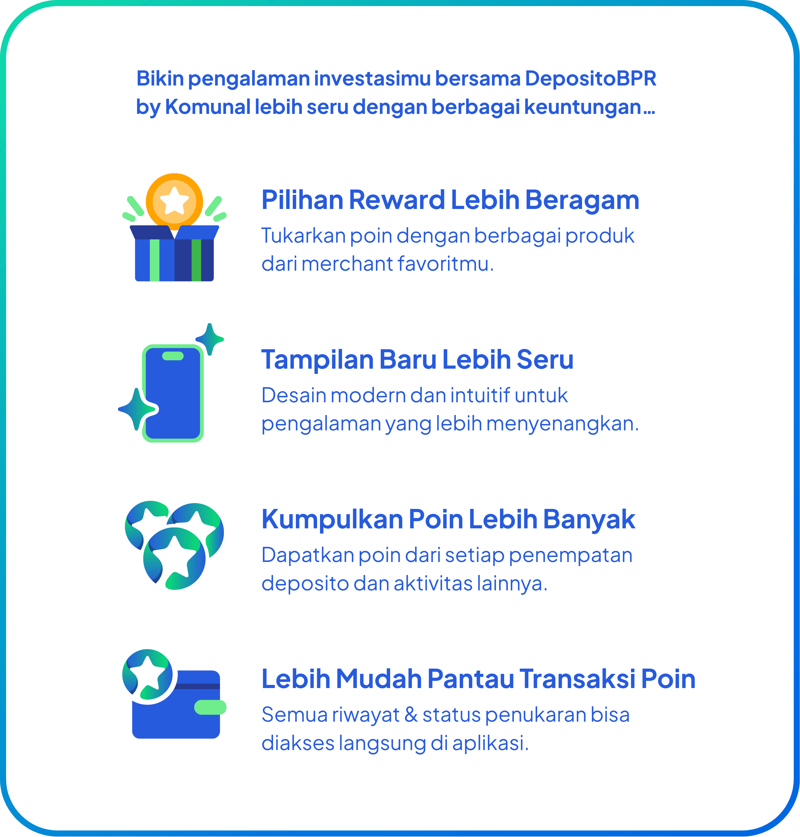 Program Rewards dari DepositoBPR by Komunal untuk semua deposan setia, yang memungkinkan kamu mendapatkan reward dan benefit lebih dari setiap transaksi depositomu.