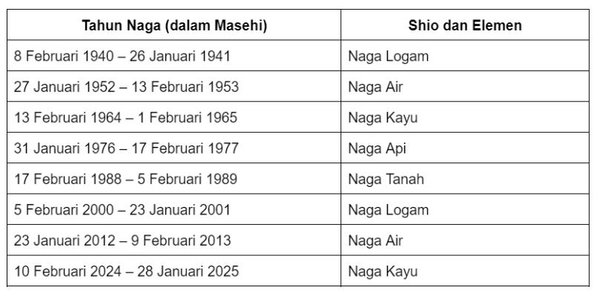 Jadi, bisa dilihat bahwa Shio Naga Kayu hanya muncul pada tahun-tahun tertentu saja dilihat dari urutan elemennya.