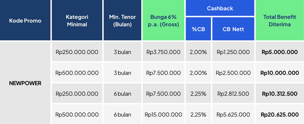 Ekstra cashback yang diterima sesuai dengan tabel promo dengan cashback nett.