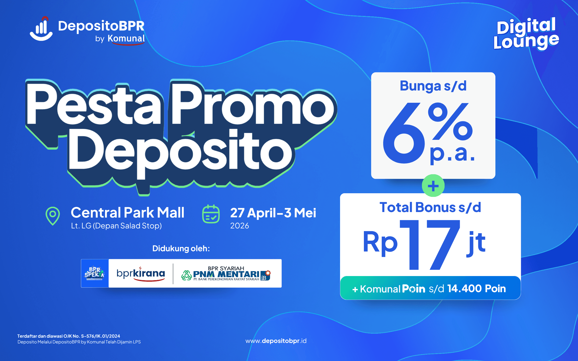 Sekarang kamu bisa mulai investasi sambil jalan-jalan lewat event spesial Digital Lounge Central Park dari DepositoBPR by Komunal. Bukan cuma sekadar cari info, di sini kamu bisa langsung buka deposito dengan bunga tinggi + bonus langsung di tempat.