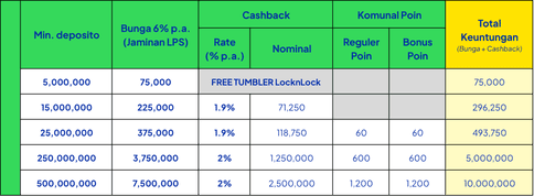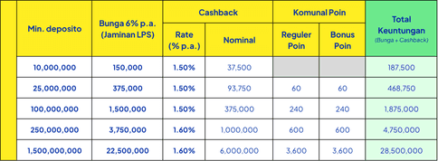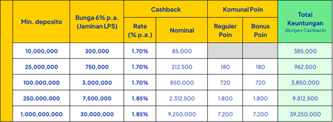 Nikmati bunga deposito hingga 6% p.a. + total bonus hingga Rp18++ Juta dan Komunal Poin hingga 28.800 poin.
