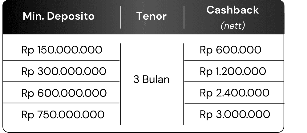 4. Cashback akan ditransfer ke rekening bank Deposan maksimal H+14 hari kerja setelah deposito jatuh tempo.