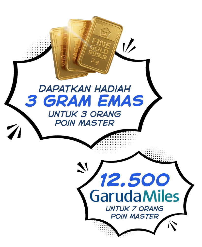 Di Poin Master: Rise Up!, kamu bisa kumpulkan poin sebanyak mungkin dan jadi Poin Master untuk menangkan hadiah 3 gram emas atau 12.500 reward GarudaMiles!