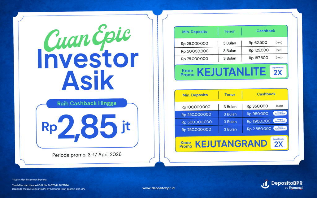 Kejutan spesial buat kamu, investor asik! DepositoBPR by Komunal hadirkan promo terbatas, khusus untuk kamu. Dengan membuka deposito mulai dari Rp25 juta, dengan tenor minimum 3 bulan, kamu bisa menikmati cashback hingga Rp2.850.000 yang dapat kamu klaim hingga 2X!