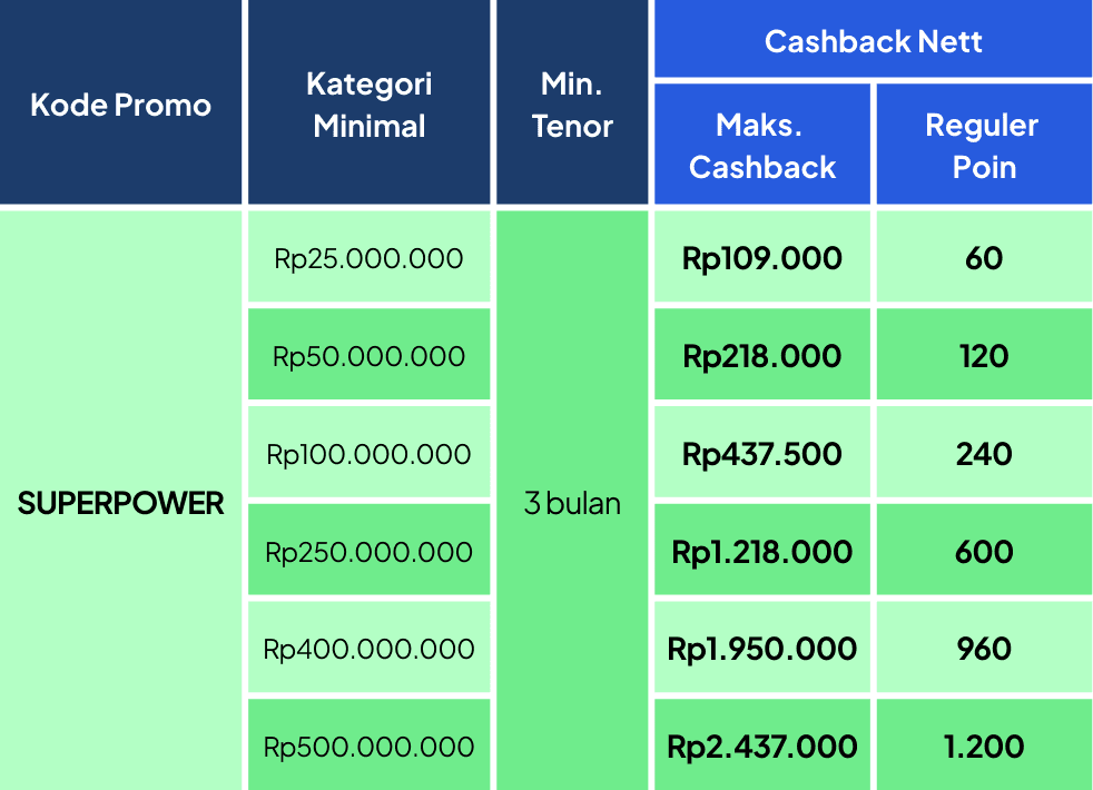 Benefit yang diterima berupa Cashback nett dan Reguler Poin sesuai dengan tabel promo