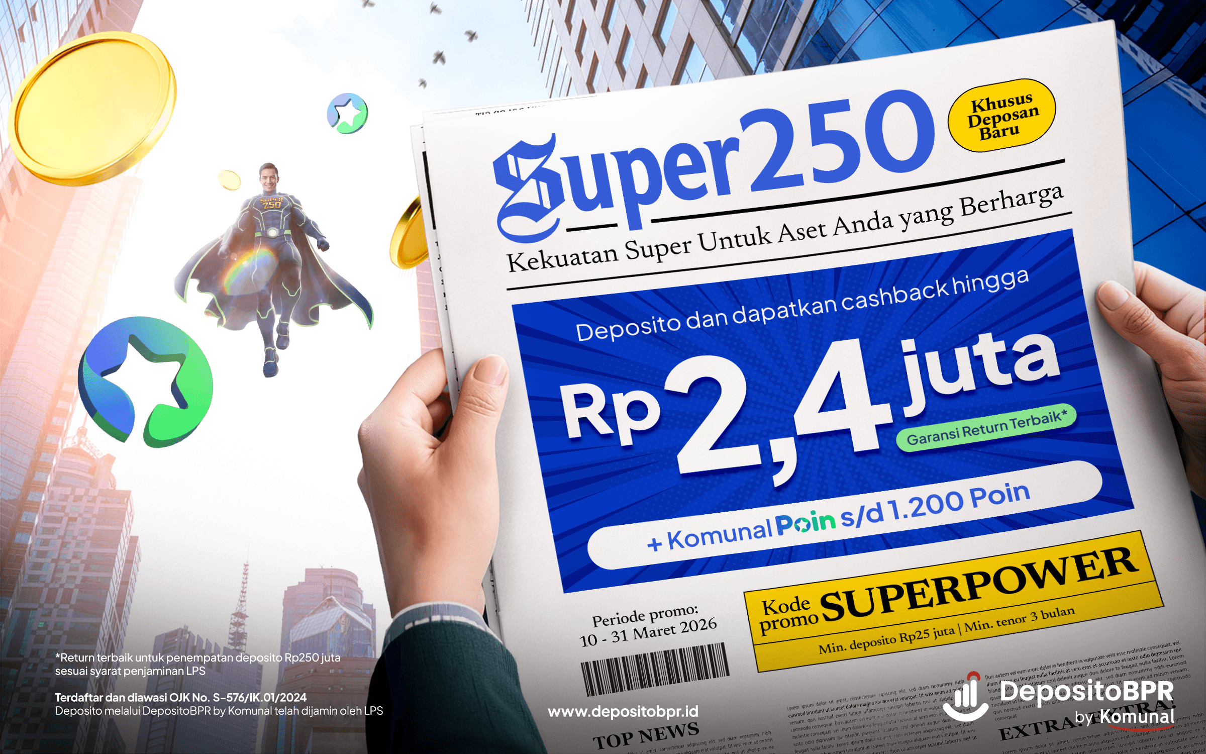 Kini lewat Promo SUPER 250, DepositoBPR by Komunal menghadirkan kesempatan untuk Anda mendapatkan cashback hingga Rp2,4 juta plus bonus Komunal Poin hanya dengan buka deposito baru mulai dari Rp25 juta.